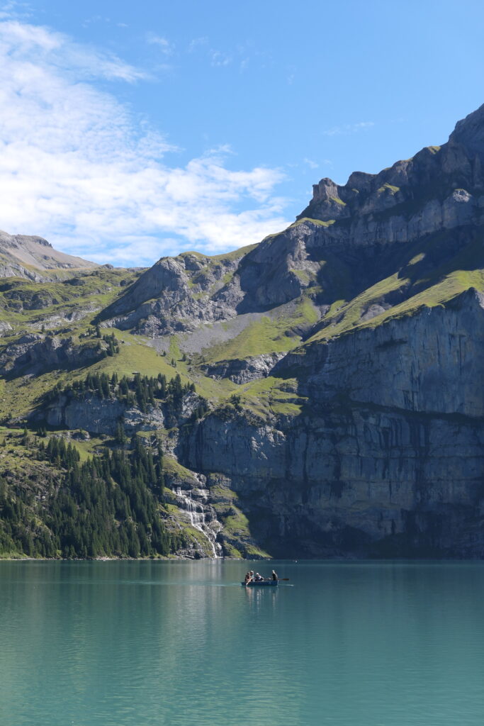 From the train station in Kandersteg, simply follow the signs toward Lake Oeschinen. Just before the trail begins, you’ll pass a conveniently located Coop supermarke, perfect for picking up some snacks for the hike. (It’s even open on Sundays!) From there, the path climbs steadily through a forested trail, winding alongside a picturesque mountain stream. Once you reached the lake, you can pause at the lakeside restaurant, enjoy a peaceful ride on a wooden paddle boat, or take a refreshing dip in the crystal-clear water. After enjoying the lake, the hike continues to a scenic viewpoint, perfect for a relaxed lunch break, ideally paired with a cold Rivella or a local beer from the small alpine kiosk nearby.