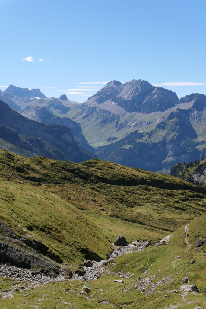 The trail then leads through a lush green valley, where you’ll pass grazing sheep and enjoy the peaceful alpine scenery. Just before reaching the Blüemlisalp Hut, there’s a challenging final ascent, a steep, leg-burning climb that will definitely test your endurance. But once at the top, you’re rewarded with breathtaking views into the surrounding valleys, and on a clear day, you can even spot Lake Thun in the distance.
